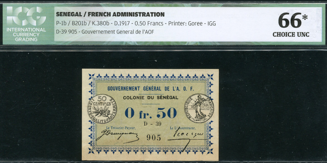 (x) Gouvernment General de l'A.O.F., Colonie du Senegal, 50 centimes, 11 February 1917, serial number D-39 905, blue and grey-green, coin at left and right, signatures of Duvigneau and Leveque, reverse black and white, text