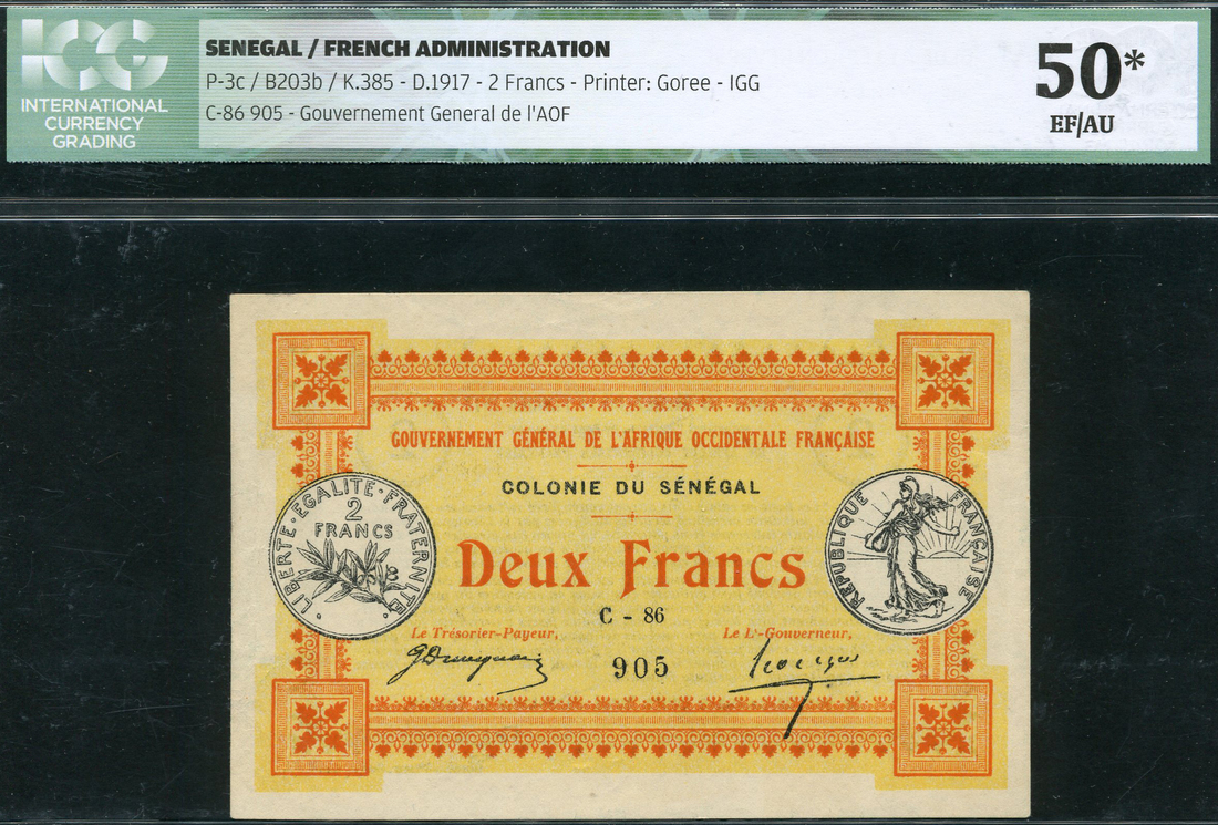 (x) Gouvernment General de l'A.O.F., Colonie du Senegal, 2 francs, 11 February 1917, serial number C-86 905, red and yellow, coin at left and right, signatures of Duvigneau and Leveque, reverse black and white, text