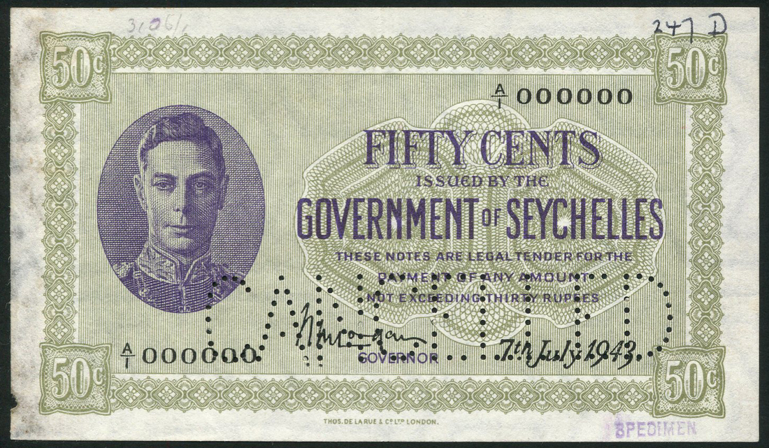 (†) Government of Seychelles, specimen 50 cents, 7 July 1943, serial number A/1 000000, purple on grey-green underprint, George VI at left, value at each corner, signature of William Marston Logan