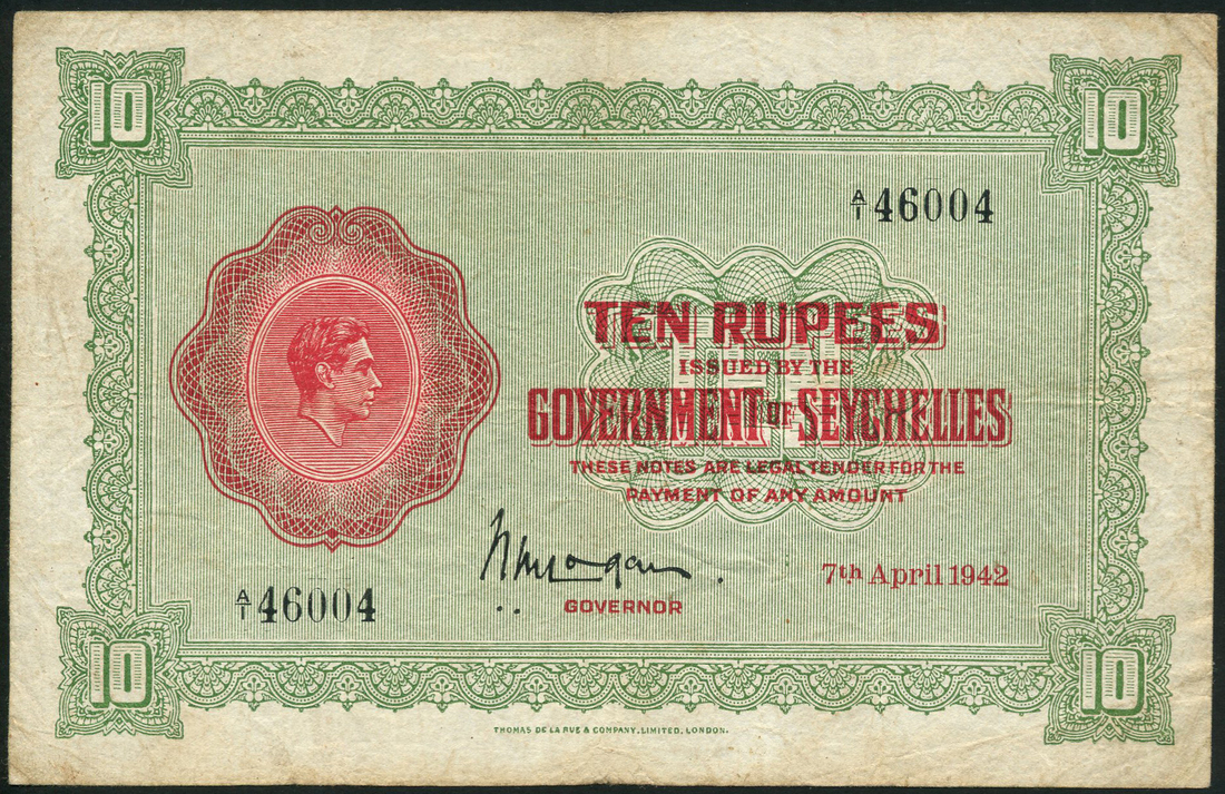 Government of the Seychelles, 5 rupees, 7 April 1942, prefix A/1, purple and green, also 10 rupees, 7 April 1942, prefix A/1, green and red, both George VI at left, Morgan signature