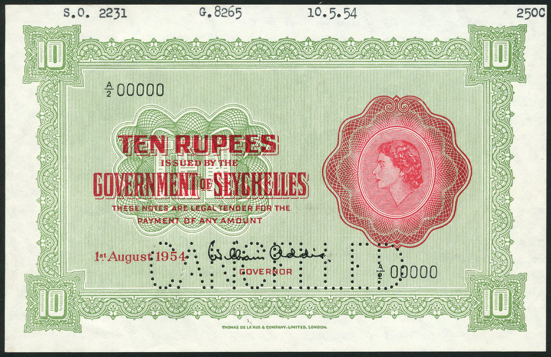(†) Government of Seychelles, specimen 10 rupees, 1 August 1954, serial number A/2 00000, red and green, Elizabeth II at right, value at corners, reverse green, arms at centre, perforated CANCELLED