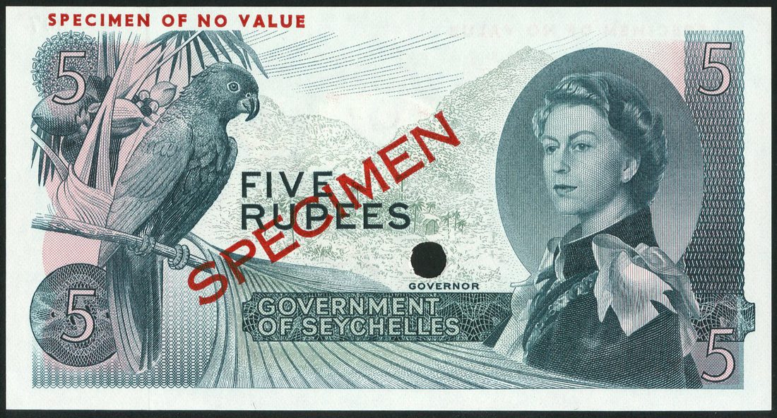 (†) Government of Seychelles, a group of 5 Rupees, 1968 Issue, comprising, 1. Progressive proof, mountains and underprint only on obverse, complete reverse; 2. Specimen complete proof, ND, no signatures; 3. Specimen, 1 January 1968, serial number A/1 000000; 4. Specimen colour trial, blue-green and pink, ND, no signature, the last three all Annigoni portrait of Queen Elizabeth II at right, black parrot at left, reverse value set in geometric patterns, the first two perforated CANCELLED, the last two overprinted SPECIMEN diagonally in red on obverse and reverse, four and one punch hole(s) respectively