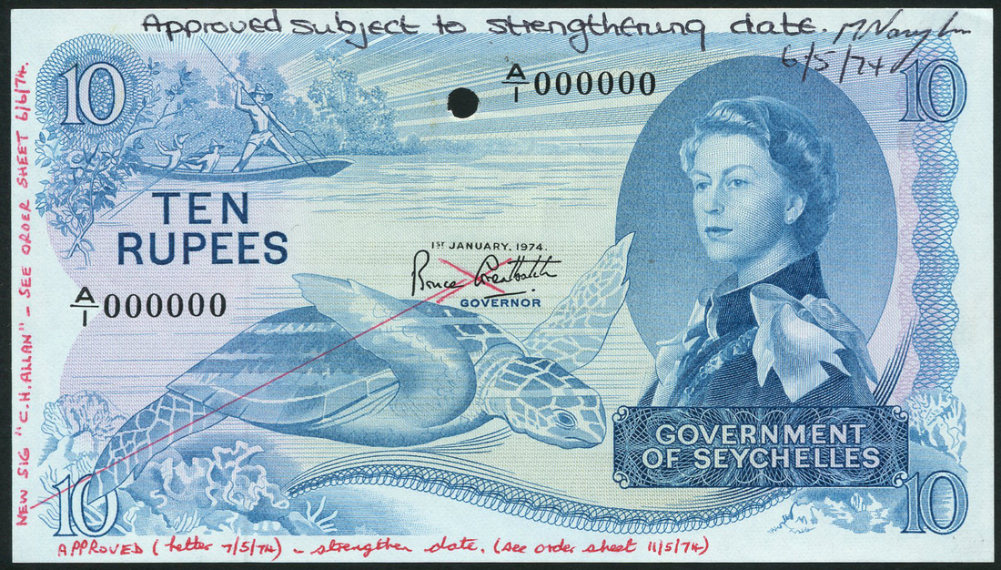 (†) Government of Seychelles, a group of 10 Rupees, 1968-74 Issue, comprising, specimen proof, ND (1967), no serial numbers, no signatures; specimen proof (2), 1 January 1974, serial number A/1 000000, incorrect signature Bruce Greatbatch, all blue and green, Annigoni portrait of Queen Elizabeth II at right, sea tortoise at left, reverse value set in geometric patterns, the first perforated CANCELLED, the last two one punch hole