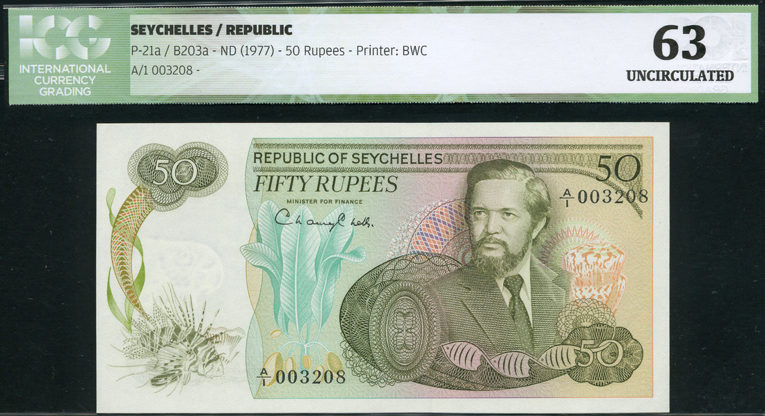 Republic of Seychelles, 20 and 50 rupees, ND (1976), serial numbers A/1 086366 and A/1 002308, purple and olive brown respectively, both with President Mancham at right, sea turtle and lionfish at low left
