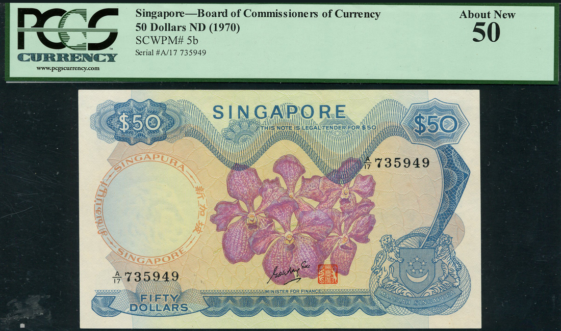 (x) Board of Commissioners of Currency, Singapore, $50, ND (1970), serial number A/17 735949, turquoise, purple and multicolour, Vanda Rothschildiana orchid at centre, arms at low right