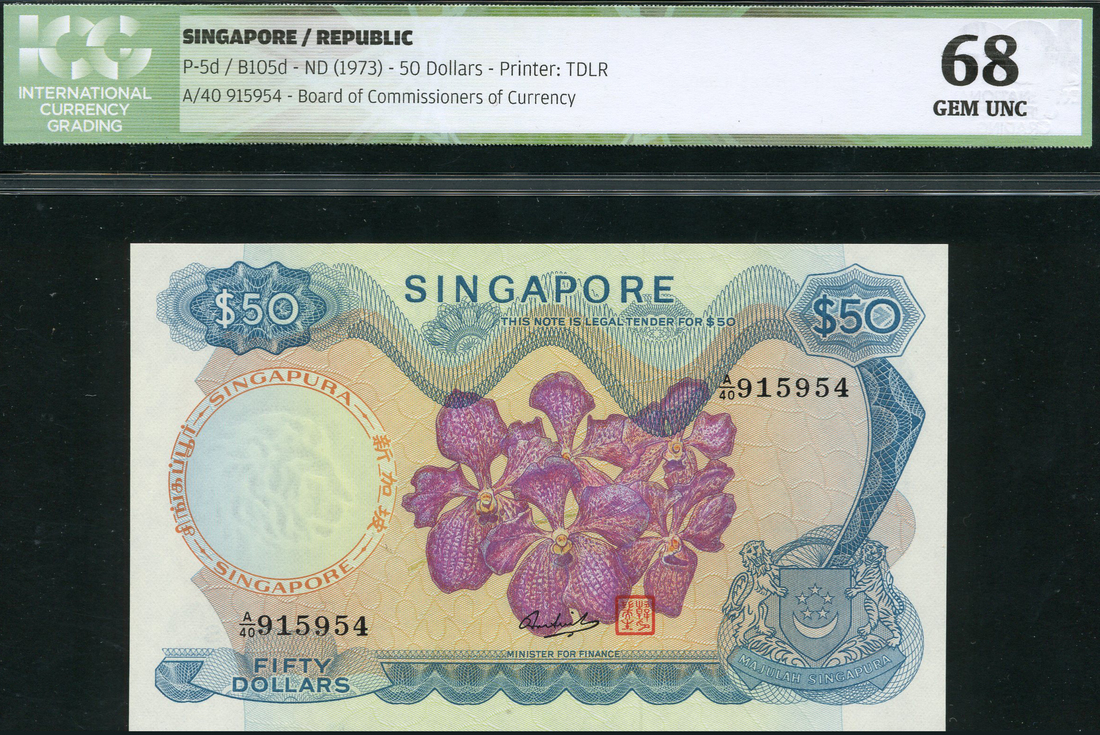 Board of Commissioners of Currency, Singapore, $50 (2), 1972, serial numbers A/40 915954-55, turquoise on violet and multicolour underprint, Vanda Rothscildiana orchid at centre, arms at low right