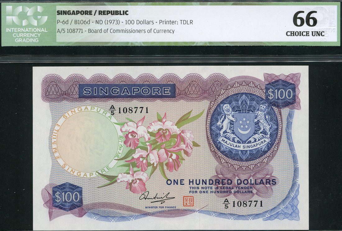 Board of Commissioners of Currency, Singapore, $100 (2), 1973, serial numbers A/5 108771-72, purple and violet on multicolour underprint, Cattleya orchid at centre, arms at right, reverse blue, sailing ships at centre