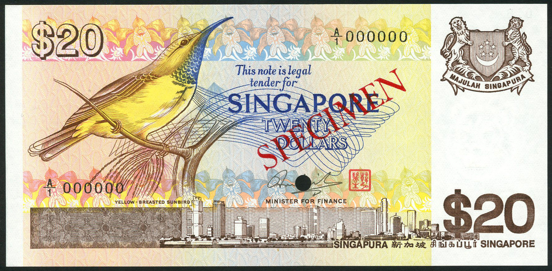 Board of Commissioners for Currency, Singapore specimen $20, ND (1979), serial number A/1 000000, brown on multicolour underprint, yellow-breasted sunbird at left, arms top right, floral border along top, view of Singapore low centre, reverse, aeroplane over Changi airport, red SPECIMEN overprint, sing hole punch