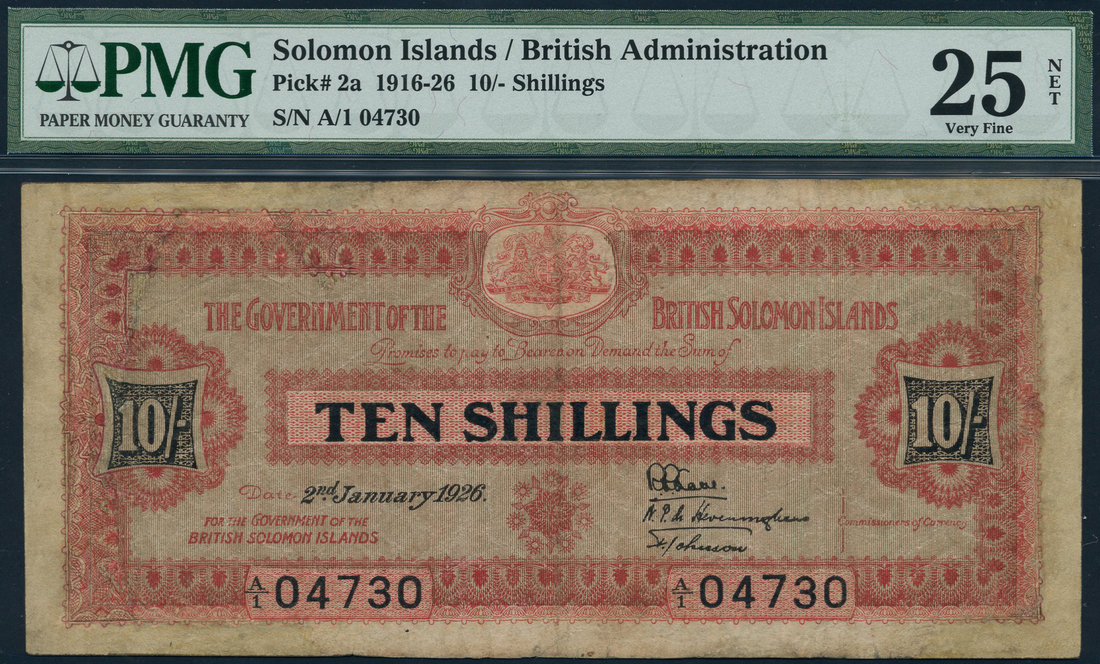 (x) Government of the Solomon Islands, 10 shillings, 2 January 1926, serial number A/1 04730, red and pale grey, arms top centre, value at centre and at left and right, three printed signatures low right