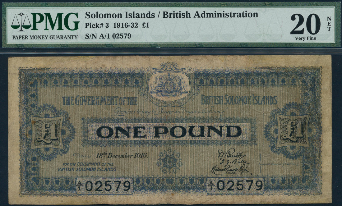 (x) Government of the Solomon Islands, £1, 18 December 1916, serial number A/1 02579, blue, arms top centre, value at centre and at left and right, three printed signatures low right