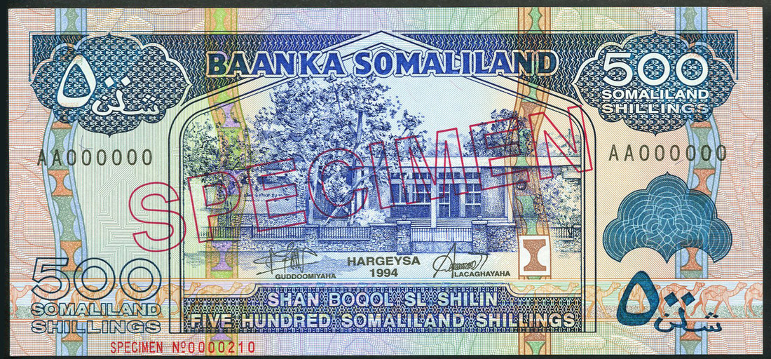 Baanka Somaliland, specimen 5, 10, 20, 50, 100 and 500 Somaliland shillings, 1994, all zero serial numbers, various colours on multicolour underprints, first four with Great Kudu at right, building at centre, reverse camel traders, last with building at centre, reverse sheep and ships, red SPECIMEN overprint,