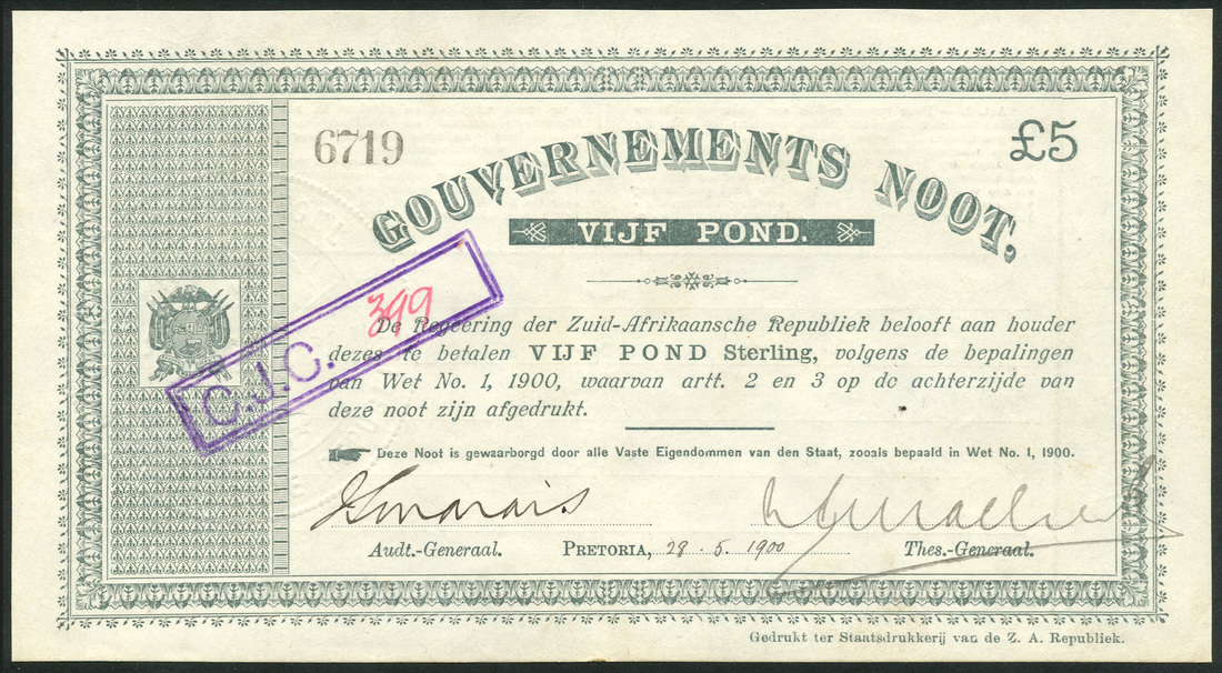 Gouvernements Noot, South African Republic, 5 pond, Pretoria, 28 May 1900, serial number 6719, 10 pond (3), serial numbers 2077,4945,5053, all grey-green and white, arms of the Republic at left, value in green tablet top centre, all purple handstamp in field from the C.J.C. (the Central Judicial commission)