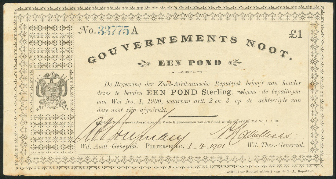 Gouvernements Noot, South African Republic, 1 pond, Pietersburg, 1 April 1901, serial number 33775A, black and white, arms of the Republic at left, manuscript signatures of the Acting Auditor-General A.P.Brugman and the Acting Treasurer-General P.R.de Villiers, also another 1 pond with serial number 20519A and purple C.J.C. overprint in field