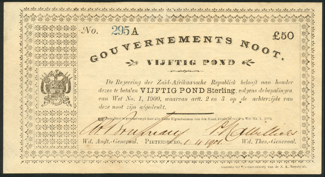 Gouvernements Noot, South African Republic, 50 pond, Pietersburg, 1 April 1901, serial number 295A, black and white, arms of the Republic at left, manuscript signatures of the Acting Auditor-General A.P.Brugman and the Acting Treasurer-General P.R.de Villiers