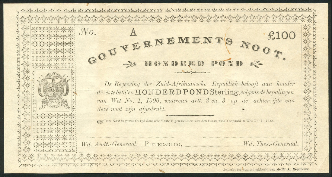 Gouvernements Noot, South African Republic, an unissued set of the Pietersburg ND (1901) series, no serial numbers except the 20 pond, serial number 349A, comprising 1,5,20,50 and 100 pond, all black and white, arms of the Republic at left, no signatures below