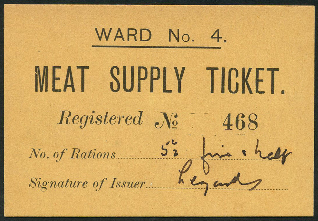 Siege of Kimberley, meat supply ticket for five and a half rations, ND (1899-1900), serial number 468, Ward 4, type 3, black text on pale beige-yellow card, amount hand written, manuscript signature below