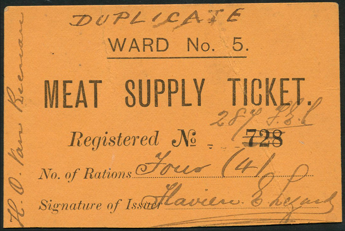 Siege of Kimberley, meat supply ticket for four rations, ND (1899-1900), serial number 728 (287), Ward 5, type 3, black text on pale orange card, amount hand written, manuscript signature below, serial number altered and initialled by hand and manuscript DUPLICATE top centre, manuscript name at left