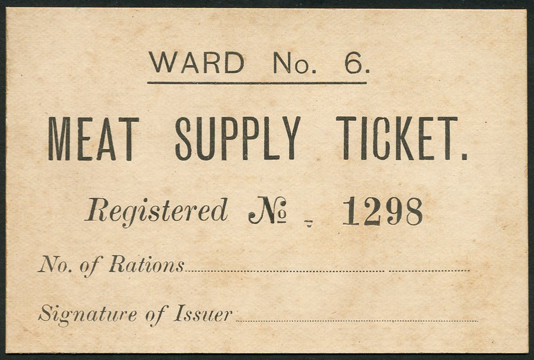 Siege of Kimberley, unissued meat supply ticket, ND (1899-1900), serial number 1298, Ward 6, type 3, black text on pale beige card