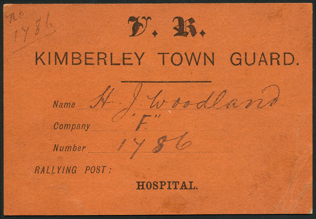 Siege of Kimberley, town guard Hospital rallying post ticket, ND (1899-1900), serial number 1786, black on orange card, manuscript signature, with a certificate of Discharge issued to J. Lonie 25 February 1900, black on beige card
