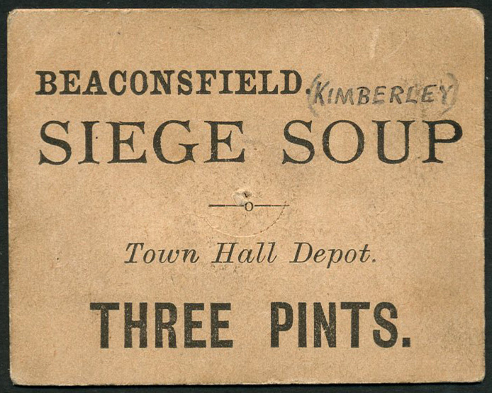 Siege of Kimberley, Suburb of Beaconsfield, siege soup ticket for three pints at the Town Hall depot, ND (1899-1900), no serial number, type 1, black text on beige card, KIMBERLEY in field top right