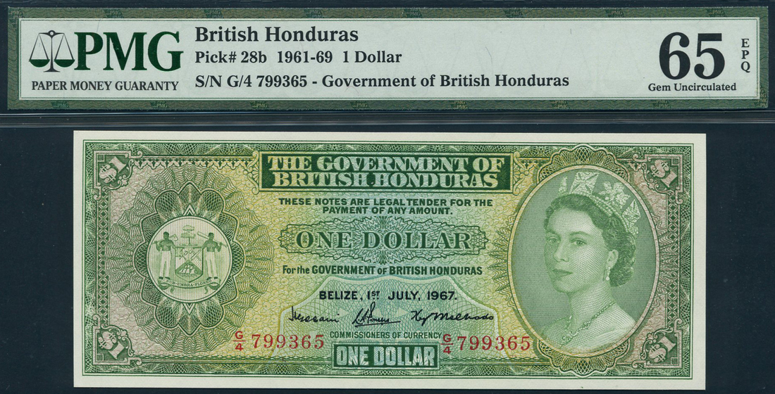 Government of British Honduras, $1, 1 July 1967, serial number G/4 799365, green in lilac and pale yellow, portrait Queen Elizabeth II in ornate circular frame at right, arms at left, value in each corner and at centre, reverse, guilloche pattern in brown and green