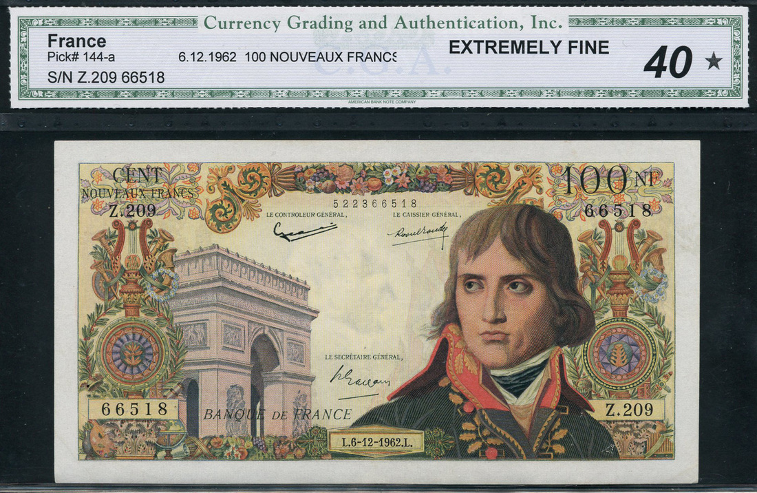 (x) Banque de France, 10NF, 1959, prefix H.12, Richelieu at right, also 100 NF, 1962, prefix Z.209, Napoleon at right