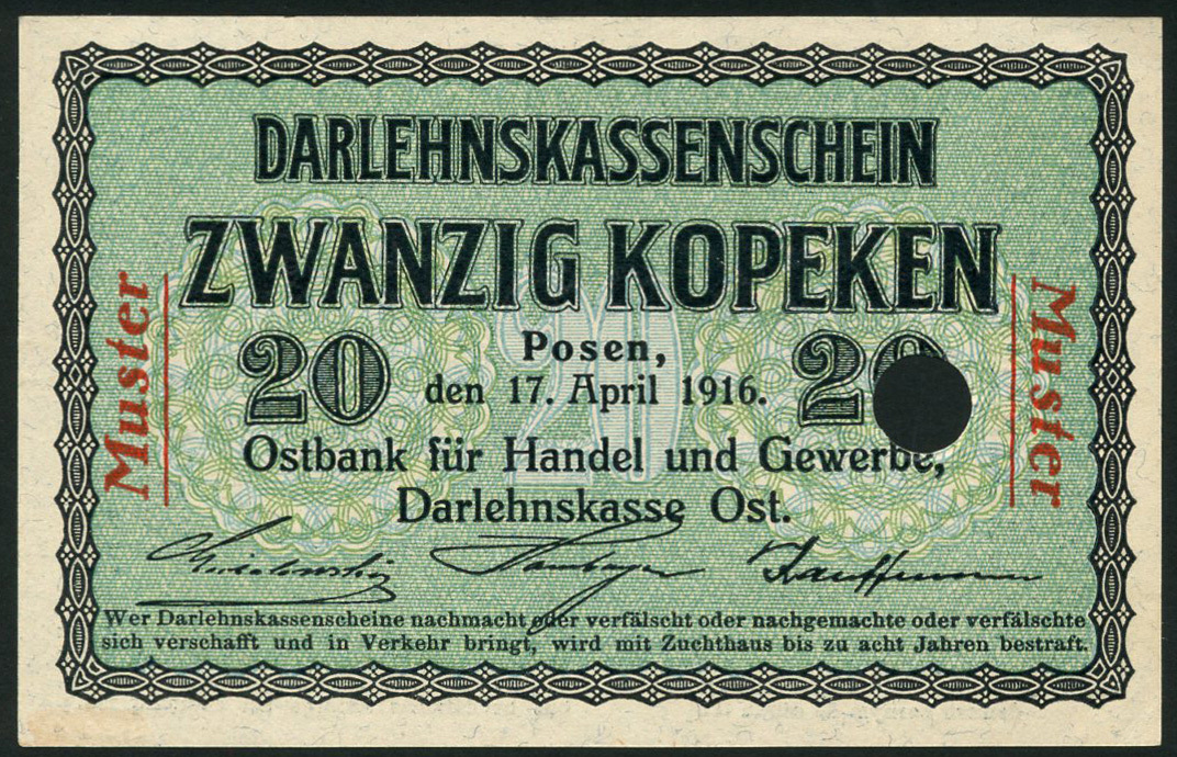 Darlehnskassenschein, specimen 20 kopeken, Posen, 17 April 1916, no serial numbers, black and green, value at left and right, red MUSTER overprint, large cancellation hole