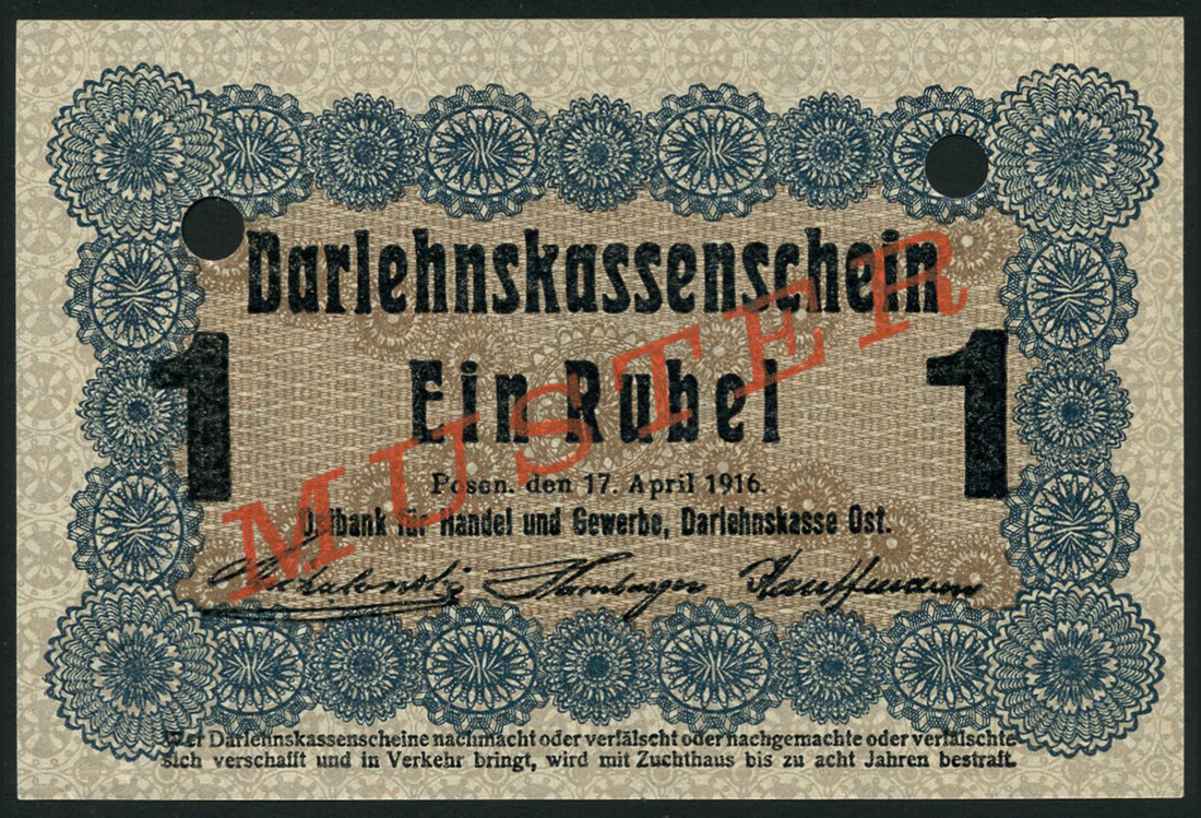 Darlehnskassenschein, specimen 1 rubel, Posen, 17 April 1916, no serial numbers, black, blue and brown, value at left and right, large red MUSTER overprint, two cancellation holes