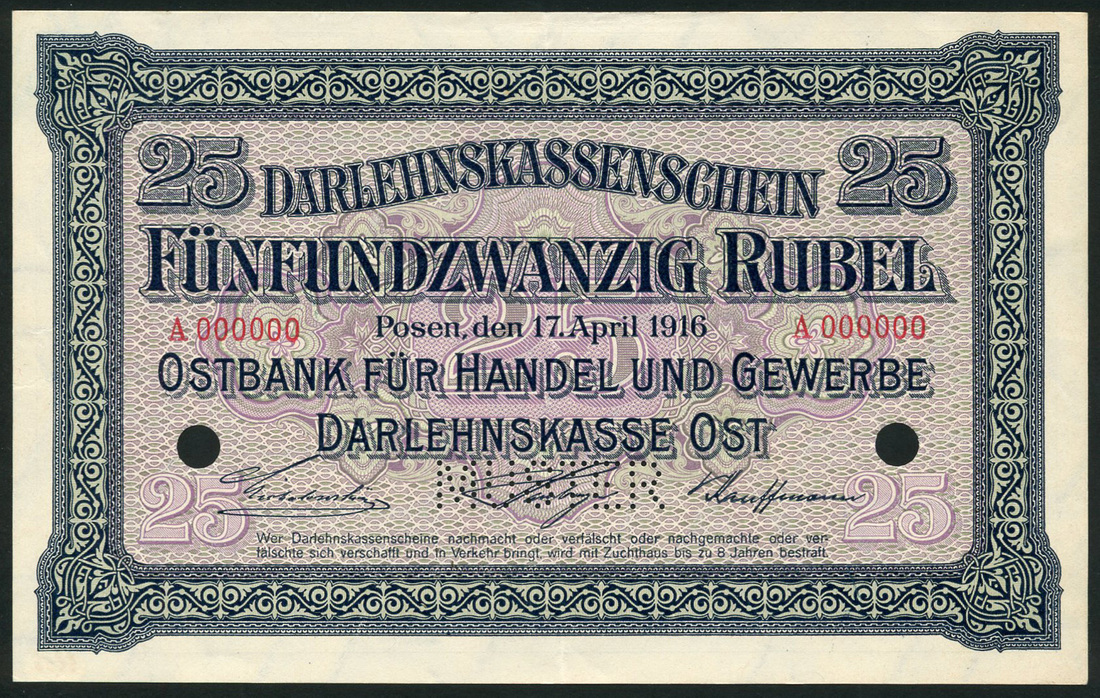Darlehnskassenschein, specimen 25 rubels, Posen, 17 April 1916, serial number A000000, dark blue on green and purple underprint, value at each corner, perforated MUSTER, two cancellation holes