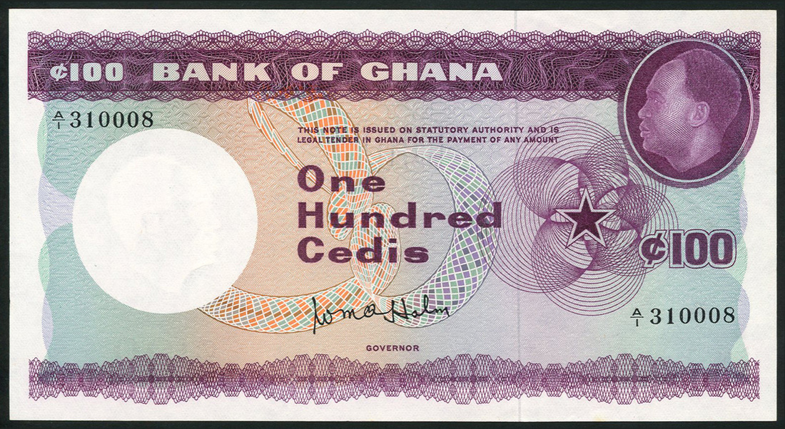 Bank of Ghana, a set of the ND (1965) series comprising 1 cedi, blue, 5 cedis, purple-brown, 10 cedis, green and lilac, 50 cedis, red and 100 cedis purple, prefixes S/2,N/1,A/1,A/1,A/1, all President Doctor Kwame Nkrumah in field, all William Halm signature, reverse various allegorical Ghanaian scenes