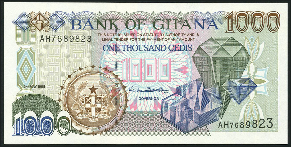 Bank of Ghana, a selection of later issues comprising 1000 cedis (4), 1996,1997,1998,1999, blue and green, 2000 cedis (5),1996,1997,1998,1999,2000, red and green, 5000 cedis (5), 1996,1997,1998,1999,2000, blue-green, 10000 cedis, 2002, violet and multicoloured, also 1,2 and 5 cedis, 2010/2011