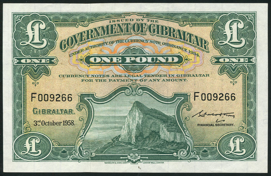Government of Gibraltar, £1, 3 October 1958, serial number F009266, green on multicolour underprint, Rock of Gibraltar at left, value at top centre and each corner