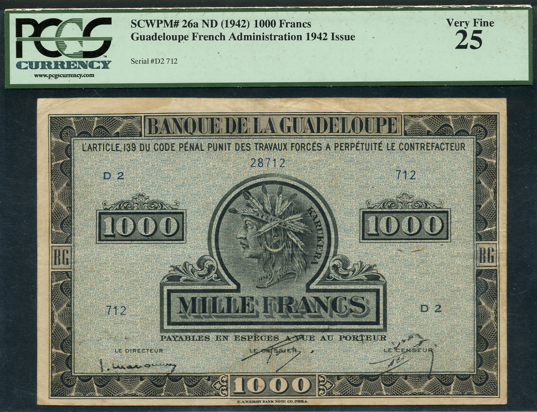 (x) Banque de la Guadeloupe, 1000 francs, ND (1943), serial number D2-712, black and pale blue, Karukera at centre, value below and at left and right, signatures of Marconnet, Gascon and Picard, reverse pink and orange, compass and value