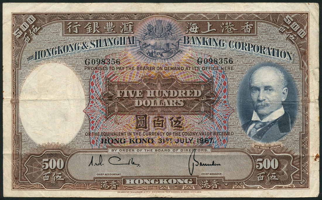Hong Kong & Shanghai Banking Corporation, $500, 31 July 1967, serial number G098356, purple brown and multicoloured, Sir Thomas Jackson at right, arms top centre, two printed signatures low centre, reverse blue, bank building at centre, Ceres at left