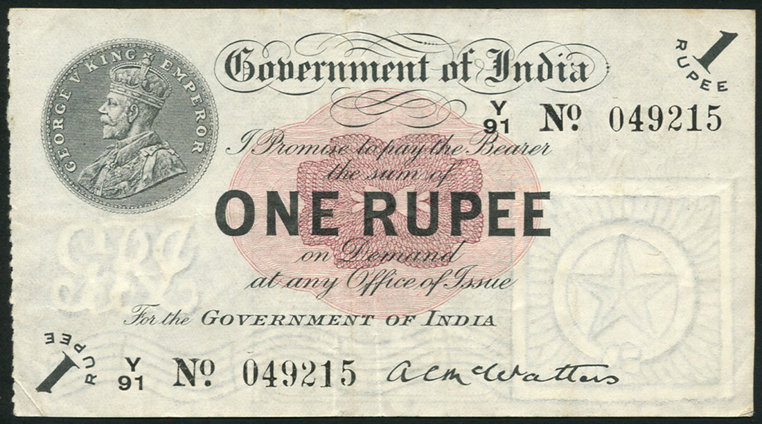 Government of India, 1 rupee (2), ND (1917), serial numbers O/94 190931 and Y/91 049215, black and white with value in red underprint at centre, 1 rupee coin top left, value at centre, McWatters signature low right, rayed star in square watermark