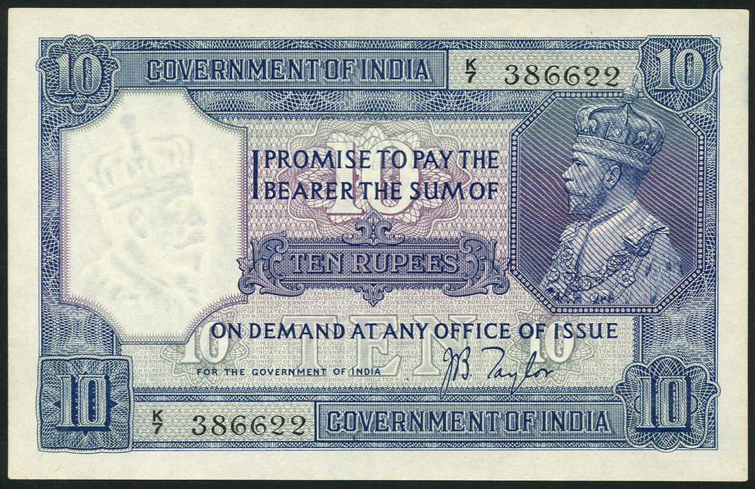 (x) Government of India, 10 rupees, serial number K/7 386622, blue on lilac and green, George V at right, J B Taylor signature variety,