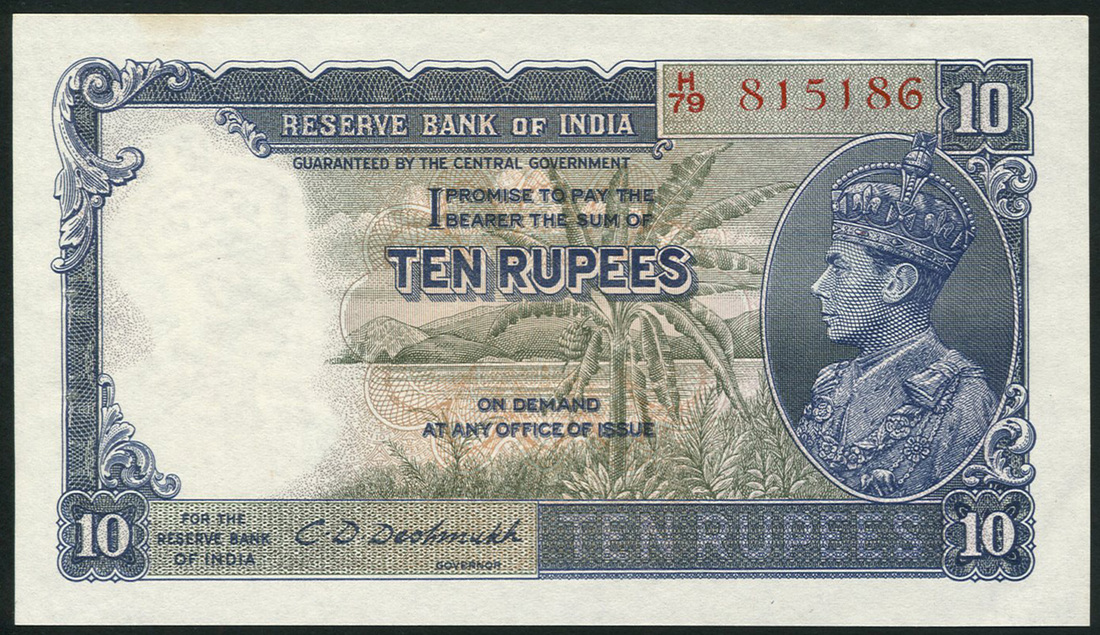 Reserve Bank of India, 10 rupees (2), ND (1944), red serial number H/79 815186/187, blue, green and white, George VI in oval frame at right, Deshmukh signature