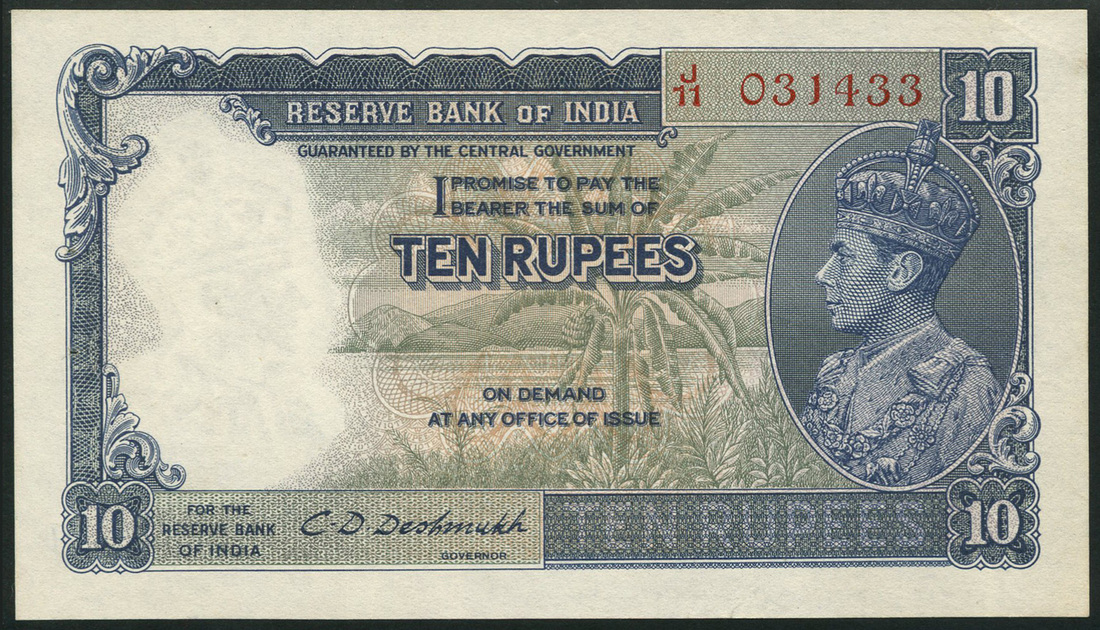 (x) Reserve Bank of India, 10 rupees, ND (1937), serial number J/11 031433, blue on multicolour, George VI at right, Deshmukh signature variety