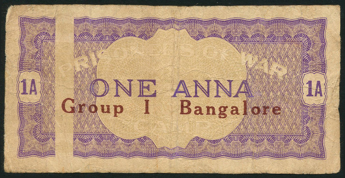 (x) Prisoner of War Camp money, India, 1 anna, Bangalore, ND (1939-1945), uniface, purple, also 1 rupee, Bangalore, ND (1939-1945), uniface, green, both with 'Group I Bangalore' in red at centre with bar at left
