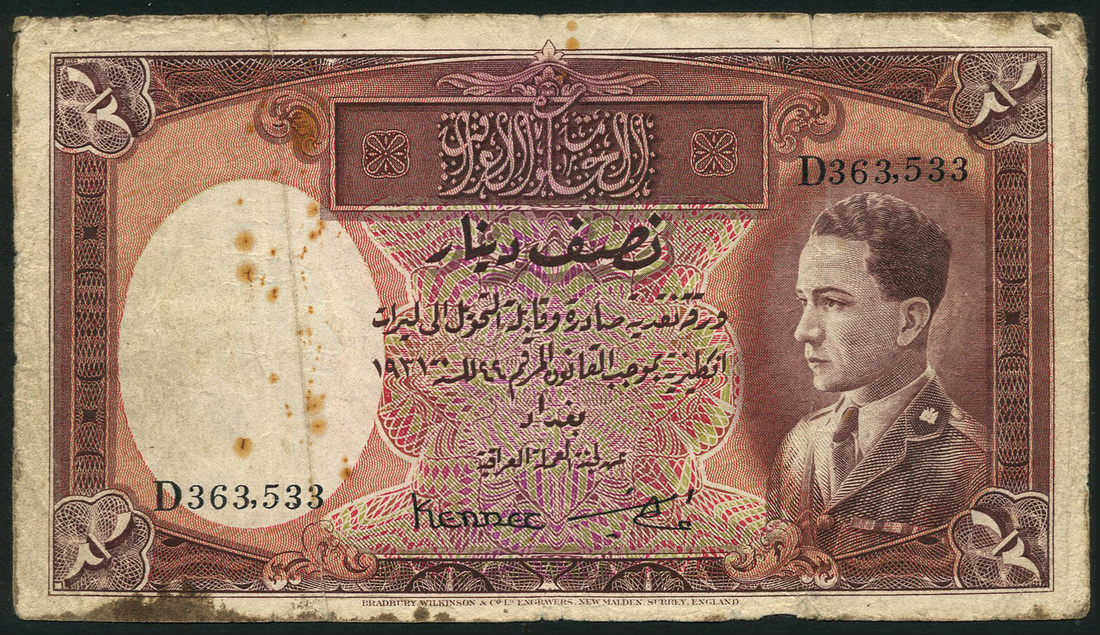 Government of Iraq, 1/4 dinar, law of 1931, prefix D, green, King Ghazi at right, Amery and al Chadirchi signatures, also 1/2 dinar, law of 1931, prefix D, brown, King Ghazi at right, Kennet and Ata Amin signatures
