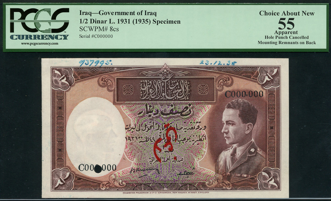 Government of Iraq, specimen 1/2 dinar, ND (1935), serial number C000000, brown on multicolour underprint, King Ghazi at right, value at corners, reverse brown, value at centre and corners, one cancellation hole, and English and Arabic cancelled overprints