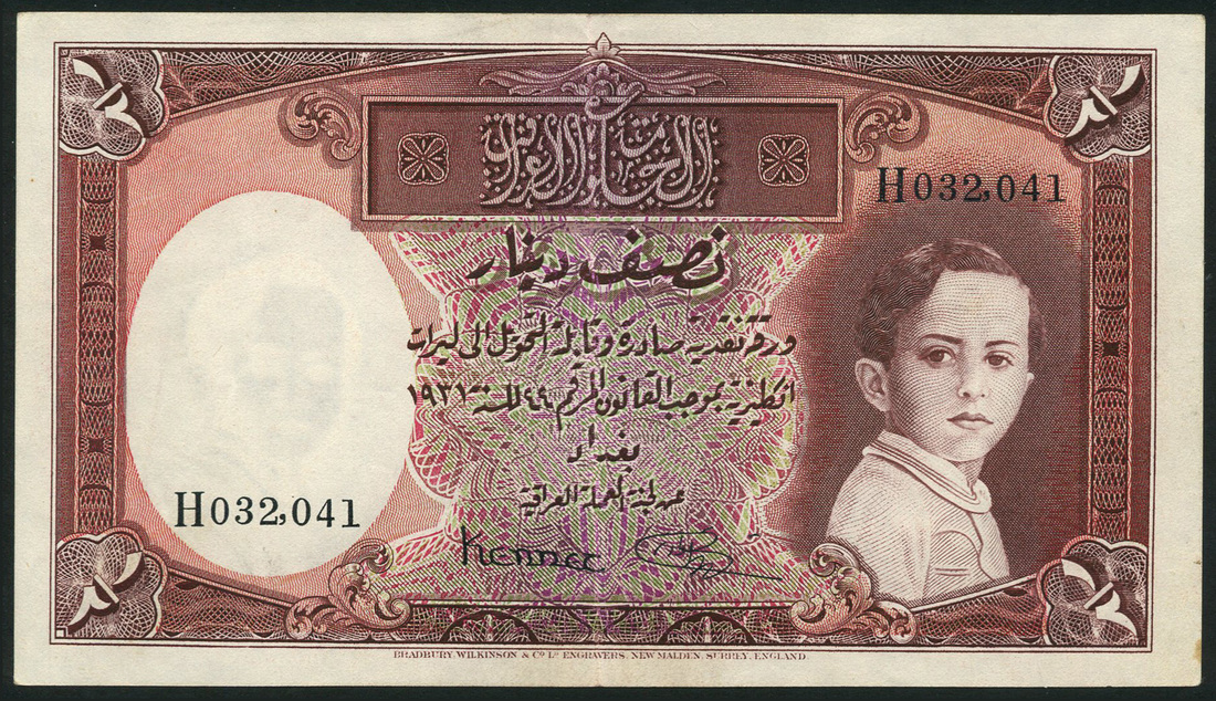 (x) Government of Iraq, 1/2 dinar, L.1931 (1942), serial number H032,041, brown on multicolour underprint, King Faisal II as a baby at right, value in each corner