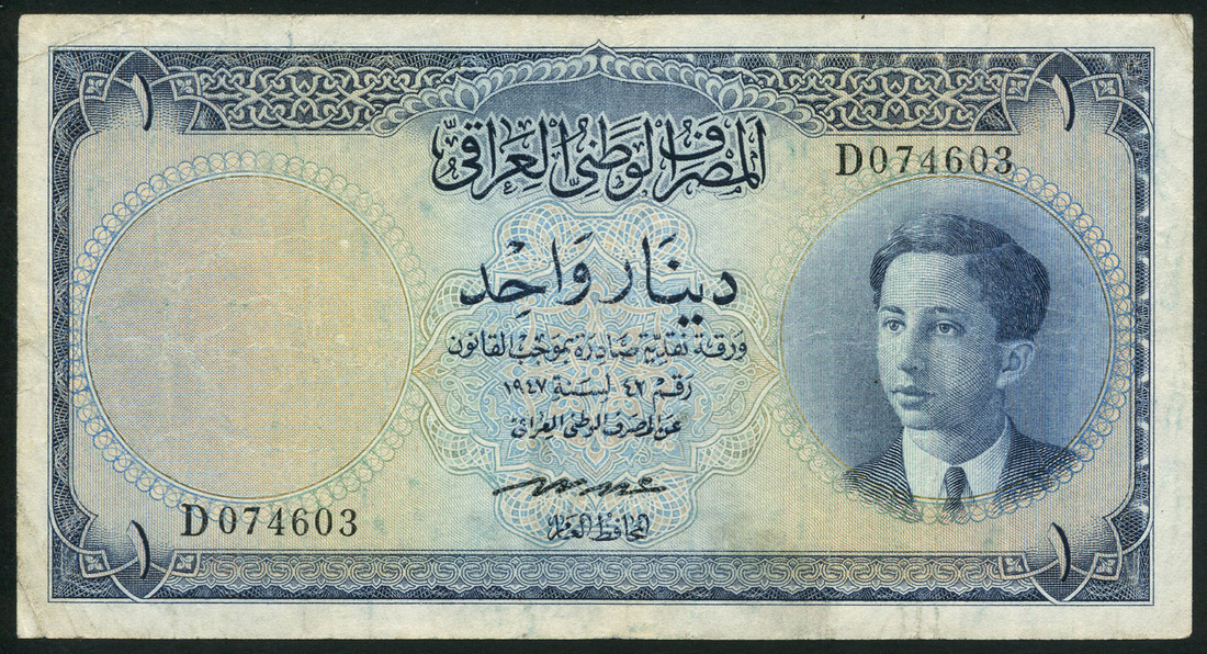 Government of Iraq, 1/4 dinar, law of 1947, prefix H, green and lilac, King Faisal II as a youth at right, value at each corner, also 1 dinar, prefix D, blue, both signature of Abdul Ilah Hafudh