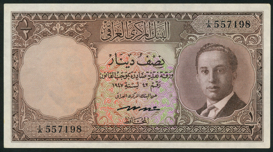 Government of Iraq, 1/2 dinar, law of 1947, prefix 1/A, brown and lilac, King Faisal II as a youth at right, value at each corner, signature of Abdul Ilah Hafudh