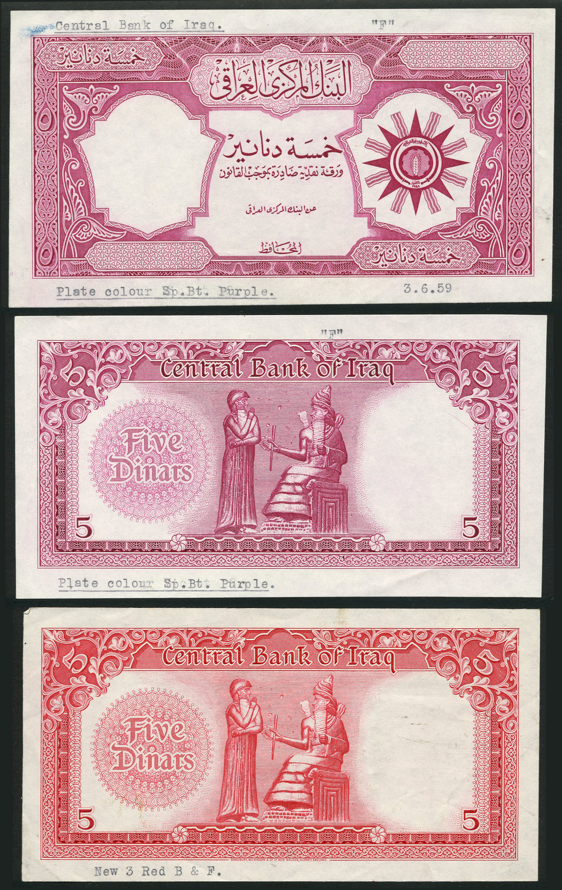 Central Bank of Iraq, obverse (1) and reverse (2) die proofs for 5 dinars, ND (1959), obverse cherry red, arms at right, first reverse cherry red, second bright red, Hammurabi receiving laws from the Sun God at centre