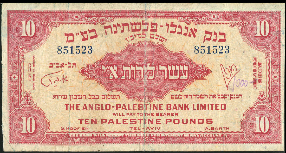 Anglo Palestine Bank Limited, a partial set of the 1948-1951 issues comprising, 500 mils, serial number 029363, £1, serial number B129113, £5, serial number A977733 and £10, serial number 851523, olive green, blue, brown and red respectively