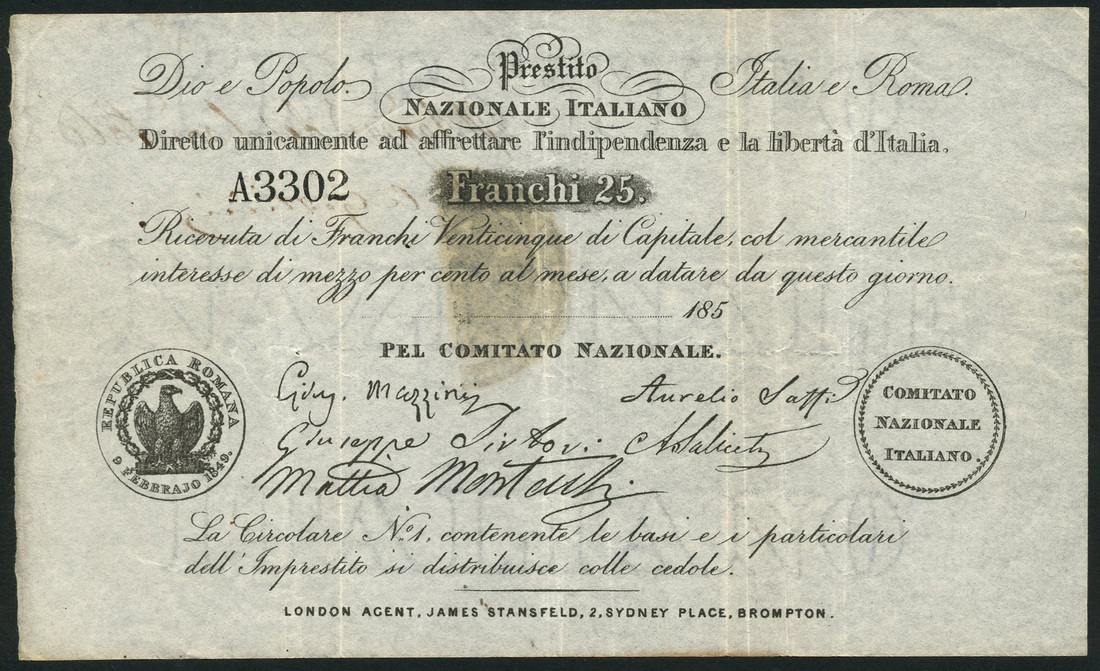 Prestito Nazionale Italiano, part issued 25 franchi, 185-, serial number A 3302, black and white, eagle low left, printed signatures low centre, manuscript signature and seal on reverse, also a contemporary envelope referring to the note