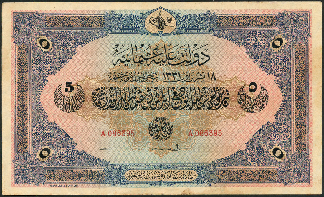 (x) State notes of the Ministry of Finance, 5 and 20 piastres, 1/4, 1/2 and 1 livre, all AH1331, also a 5 livres, purple, signatures of Talat and Cahid