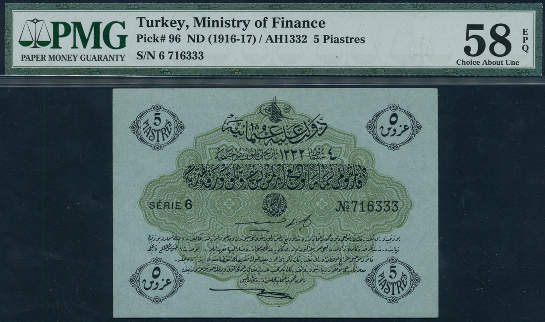 (x) Ministry of Finance, Turkey, 1 piastre, green, 2 1/2 piastres, red, 5 piastres, olive, 20 piastres, orange-brown with repeater serial number 039039, 5 piastres, pale blue and green, all AH 1332 (1916-1917), all toughra top centre