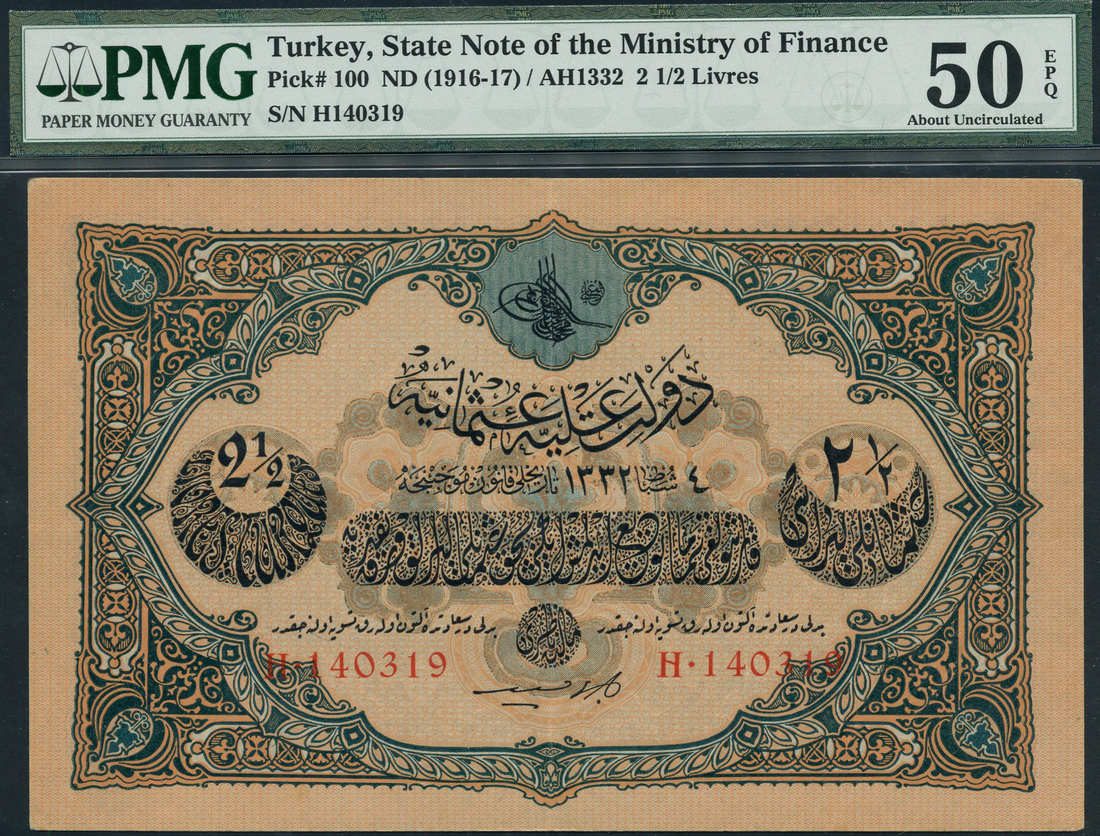 (x) State notes of the Ministry of Finance, Turkey, 2 1/2 livres, AH 1332 (1916-1917), red serial number H 140319, tan, pale pink, blue and orange-brown, toughra of top centre, value at left and right, signatures of Cavid and Cahid, reverse pale blue and maroon, arabesque design in field